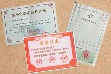 紅旗過濾全自動過濾機(jī)專利證書和多項榮譽(yù)證書